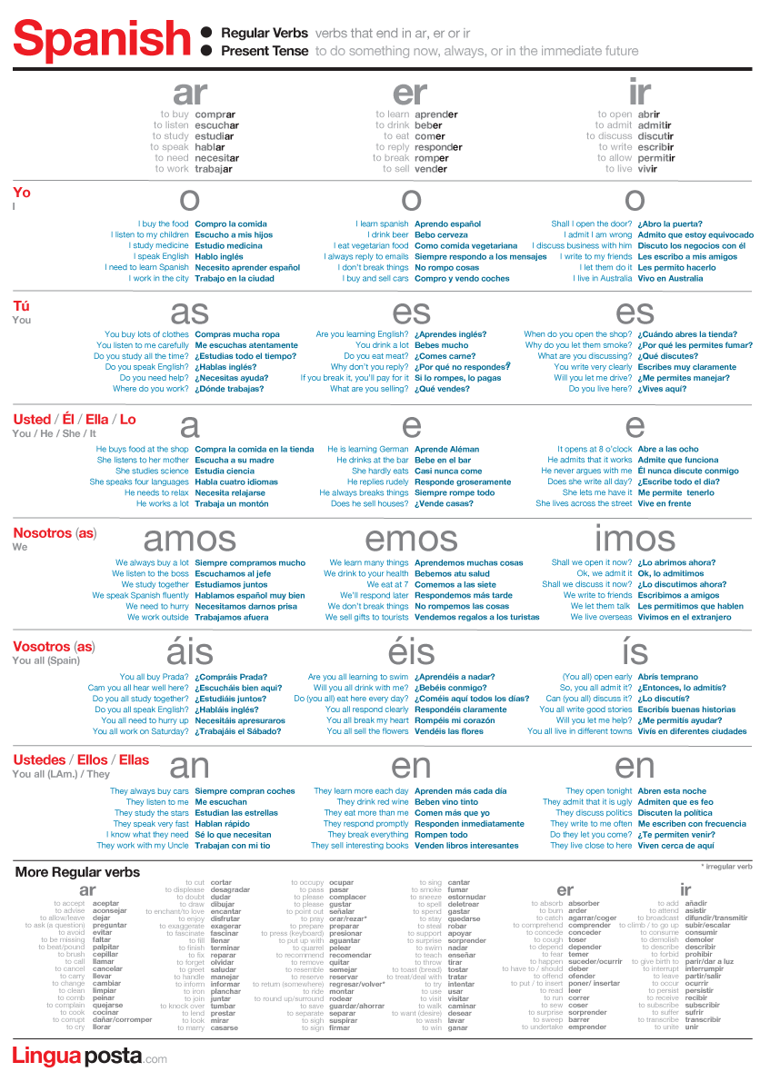 Our very popular Spanish regular verbs poster contains the first verbs you need to master in Spanish. These verbs are the most commonly used and fortunately, they all follow the same three patterns.